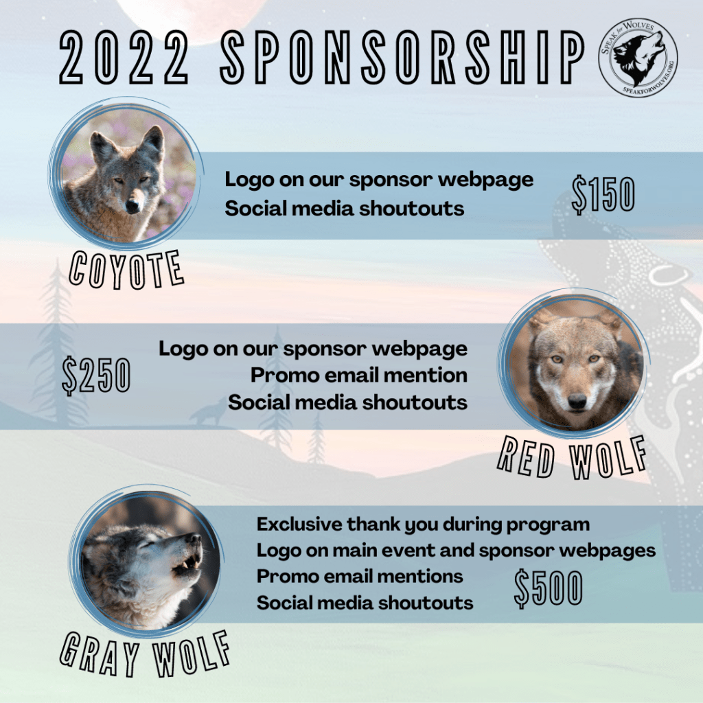 Interested in sponsoring the Speak for Wolves 2022 Conference? Support from sponsors helps us keep our grassroots conference accessible to all. Reach out to us at info@speakforwolves.org!