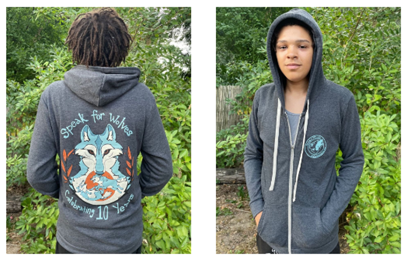 Our 10th Anniversary original artwork by @keikofitz on the back of a super soft Royal Apparel 50% Organic Cotton, 50% RPET recycled polyester grey zip-up French terry hoodie, with the Speak for Wolves logo in light blue on the front.